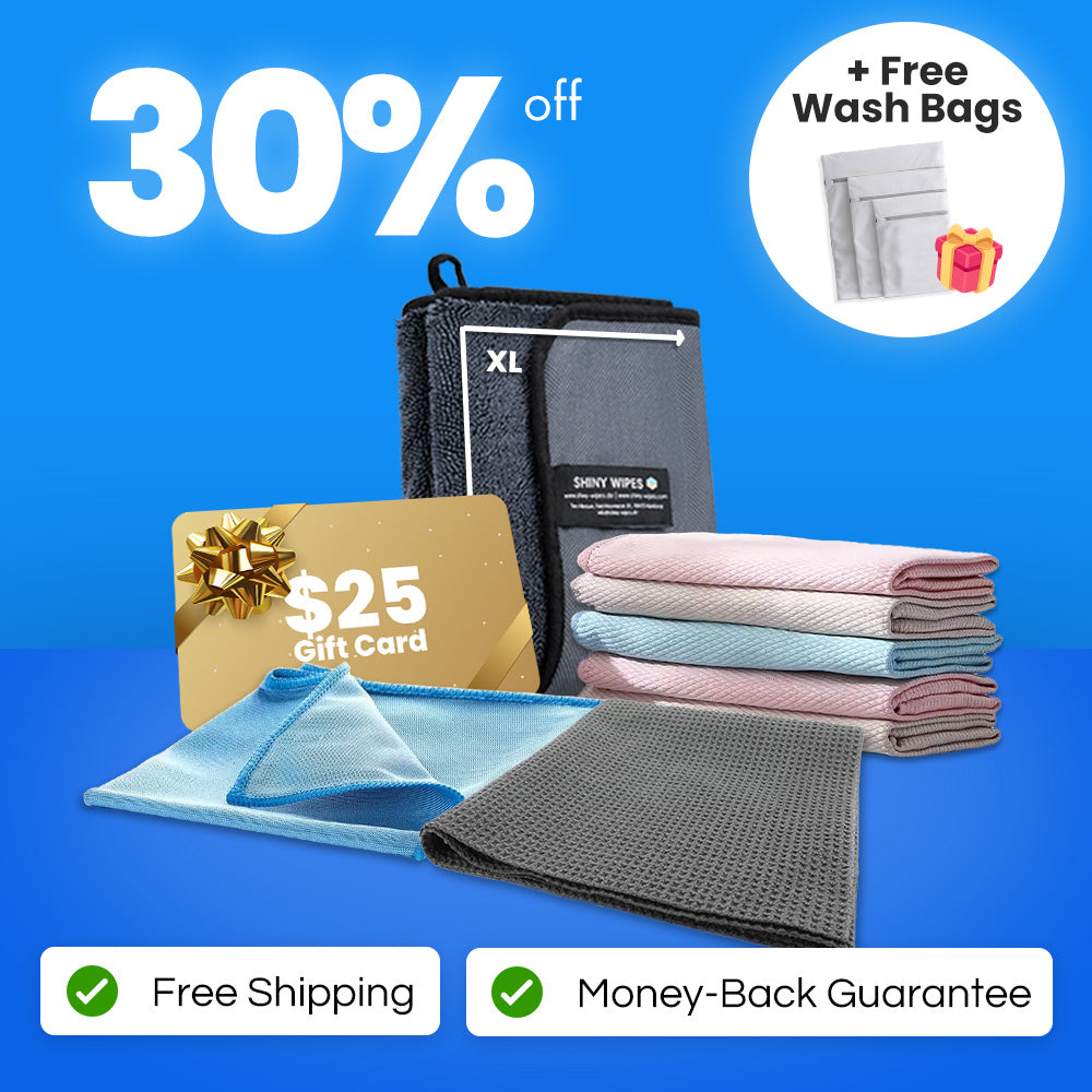 Everything you need to clean, dry, and polish your home to a sparkling shine. The Dry & Shine Bundle includes our Shiny Bath™ XL Drying Towel, a set of 5 All-Purpose Cloths, the XL Window Cloth, and the Glass Polishing Cloth - plus a $25 USD Shiny Wipes™ gift card! Get 30% off compared to buying individually, plus enjoy free shipping, a 30-day money-back guarantee, and a free set of washing bags to keep your cloths in top shape.