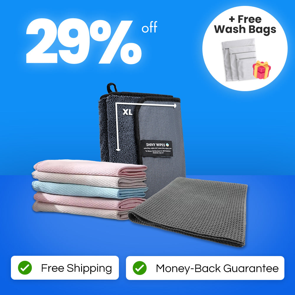 Everything you need for a spotless, streak-free shower without the hassle! The Spotless Shower Bundle includes our bestselling Shiny Bath™ XL Drying Towel, a set of 5 Shiny Wipes™ All-Purpose Cloths, and the XL Window Cloth for crystal-clear glass. Get 29% off compared to buying individually, plus enjoy free shipping, a 30-day money-back guarantee, and a free set of washing bags to keep your cloths in top shape.